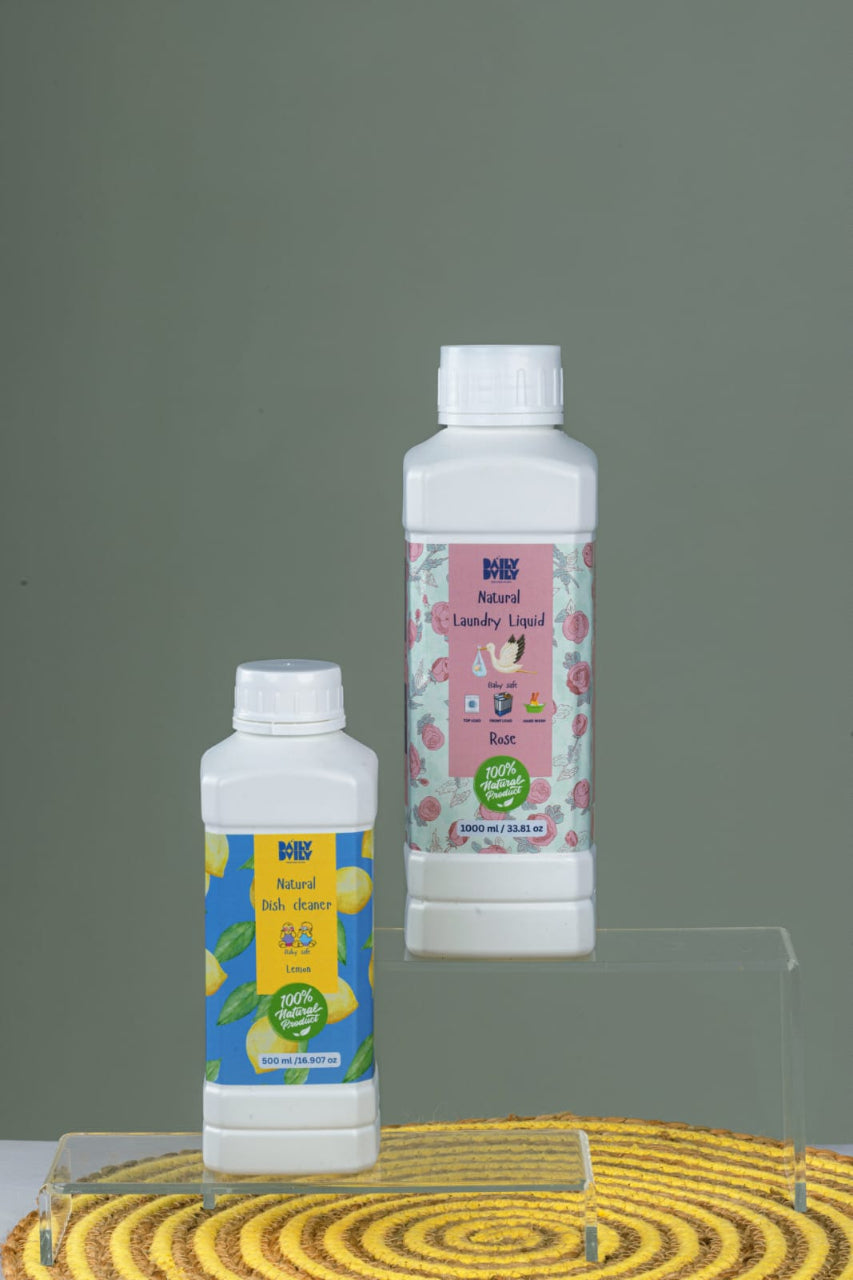 The Daily Daily Clean Duo is your everyday cleaning companion. Our powerful natural laundry liquid keeps your clothes fresh and spotless, while the dish wash liquid cuts through tough grease without harming your hands or the planet.